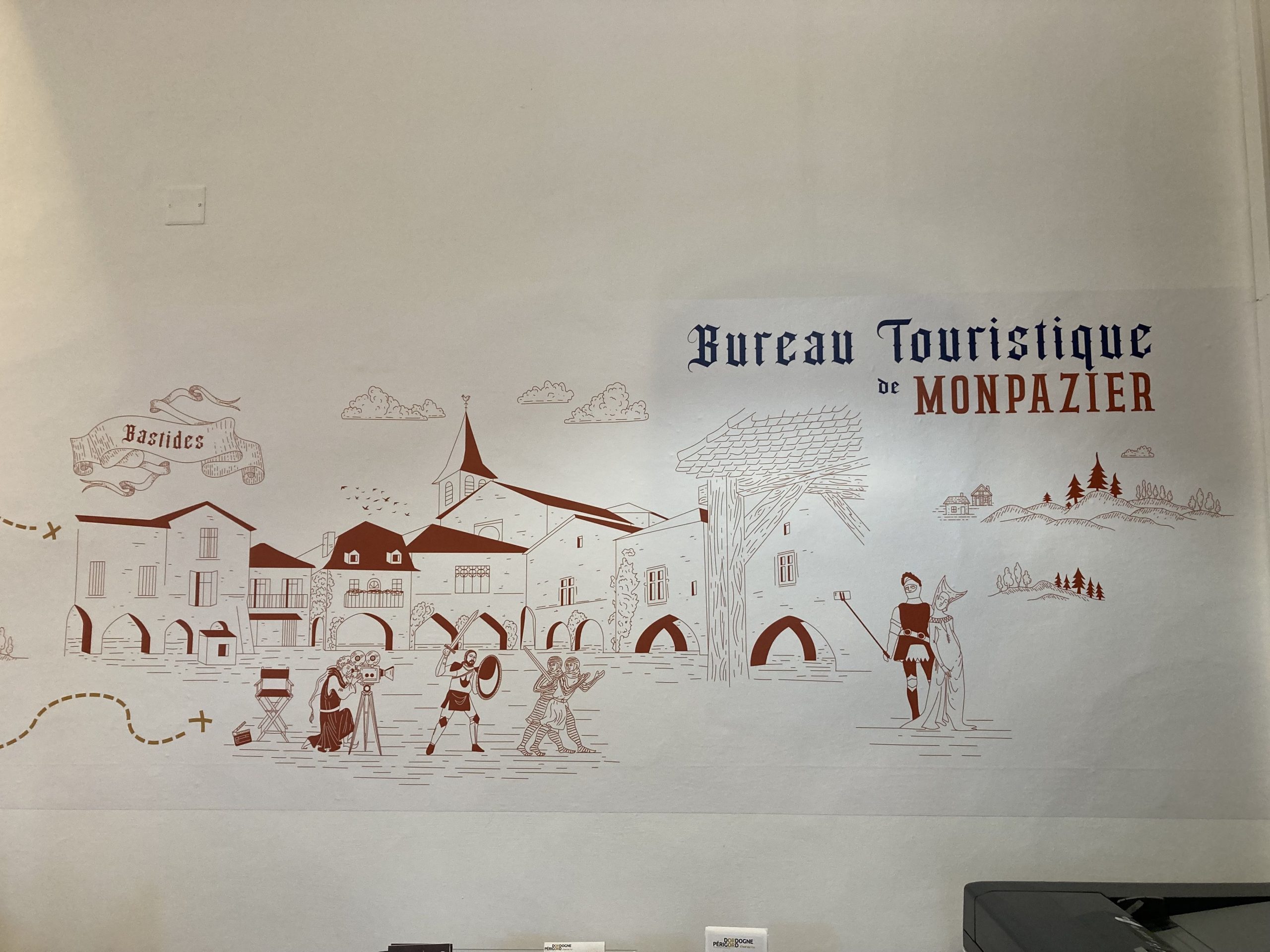 Cette opération s’achève après huit mois de travaux menés par l’équipe de l’Office de Tourisme assistée par des professionnels et artisans locaux sous la direction de Pauline Gasseling. Les travaux ont été effectués conjointement sur les trois espaces touristiques de Monpazier, de Cadouin et de Beaumont en Périgord. Dans chaque lieu, il a été imaginé une frise murale graphique qui reprend les caractéristiques identitaires du territoire. Une grande carte touristique répertorie tous les monuments, sites, curiosités, lieux touristiques, vignobles du pays de Bergerac Vignobles & Bastides. Une grande table d’interprétation avec des trapes ouvertes sur un dispositif ludique et/ou pédagogique permet de comprendre les particularités de ce territoire en manipulant des objets en lien avec l’identité et l’environnement de chaque espace touristique. Ce dispositif dynamique et interactif est complété par une boutique.
