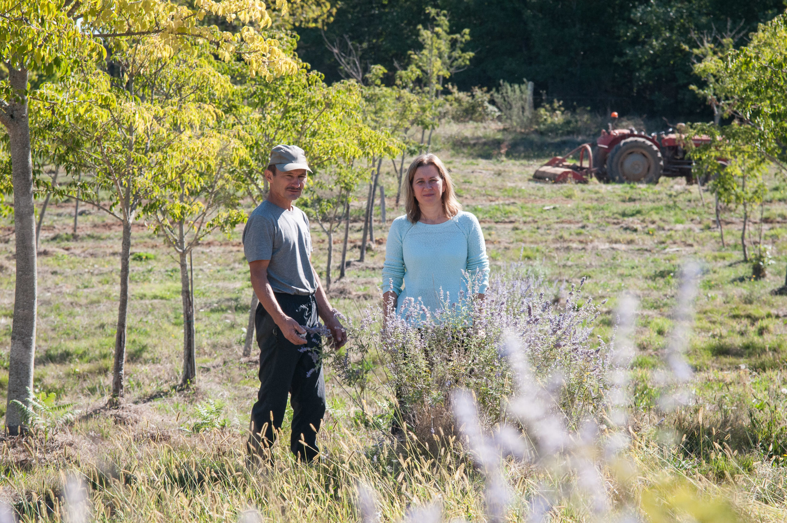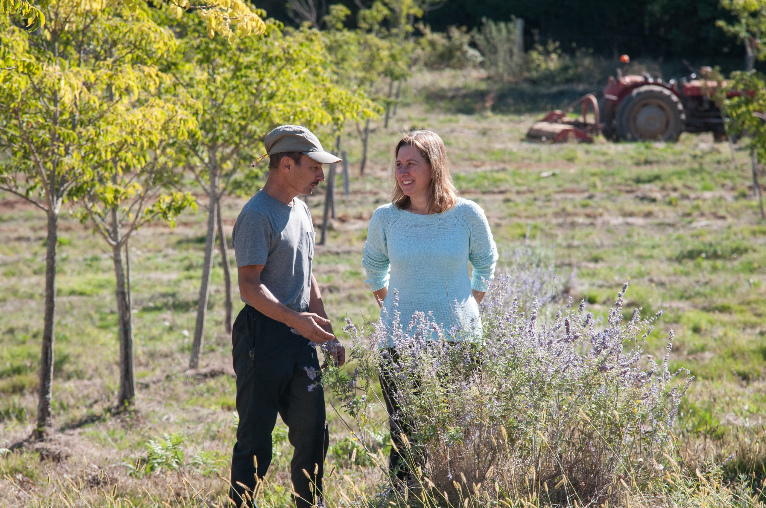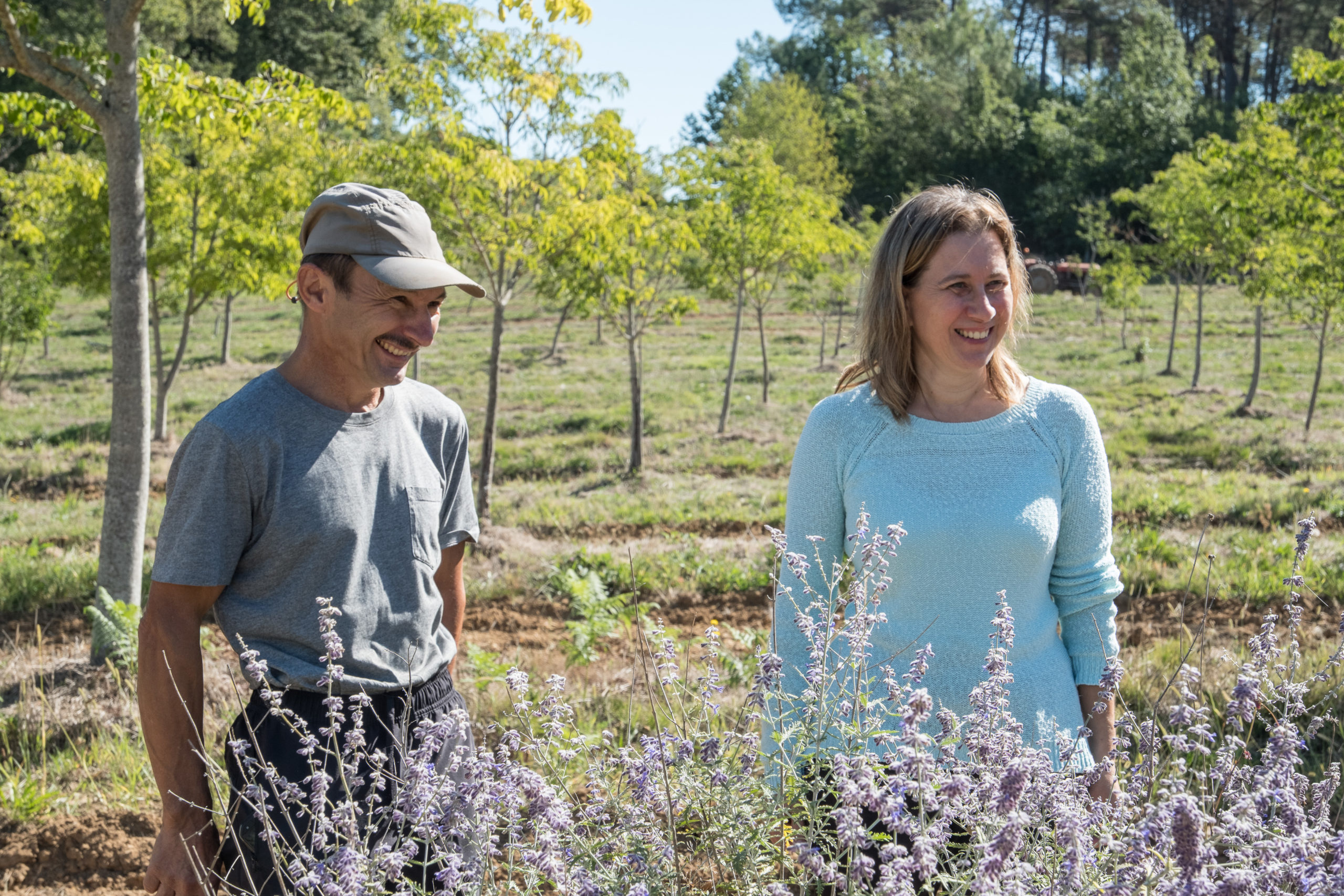 Sa préoccupation est aussi de créer les conditions pour que les abeilles butinent toute l’année, tout en considérant la nature géologique du sol. Un sol argileux présente l’avantage de retenir plus facilement l’eau, mais il peut se contracter en cas de sécheresse. L’enjeu est donc de trouver un équilibre entre la sélection des espèces, la nature du sol et l’apport en eau. Le choix des arbres, producteurs de nectar est donc primordial : évodia (appelé l’arbre à miel), tilleul, lonicera, plusieurs sortes de romarins, acacia, fevier d’Amérique … au milieu des arbres il sème des jachères mellifères et pollinifères : sainfoin, phacélie, thym sauvage, plusieurs types de romarins, lavande d’Afghanistan, vipérine … Le mélilot est très apprécié des abeilles parce qu’il est très abondant en nectar.
