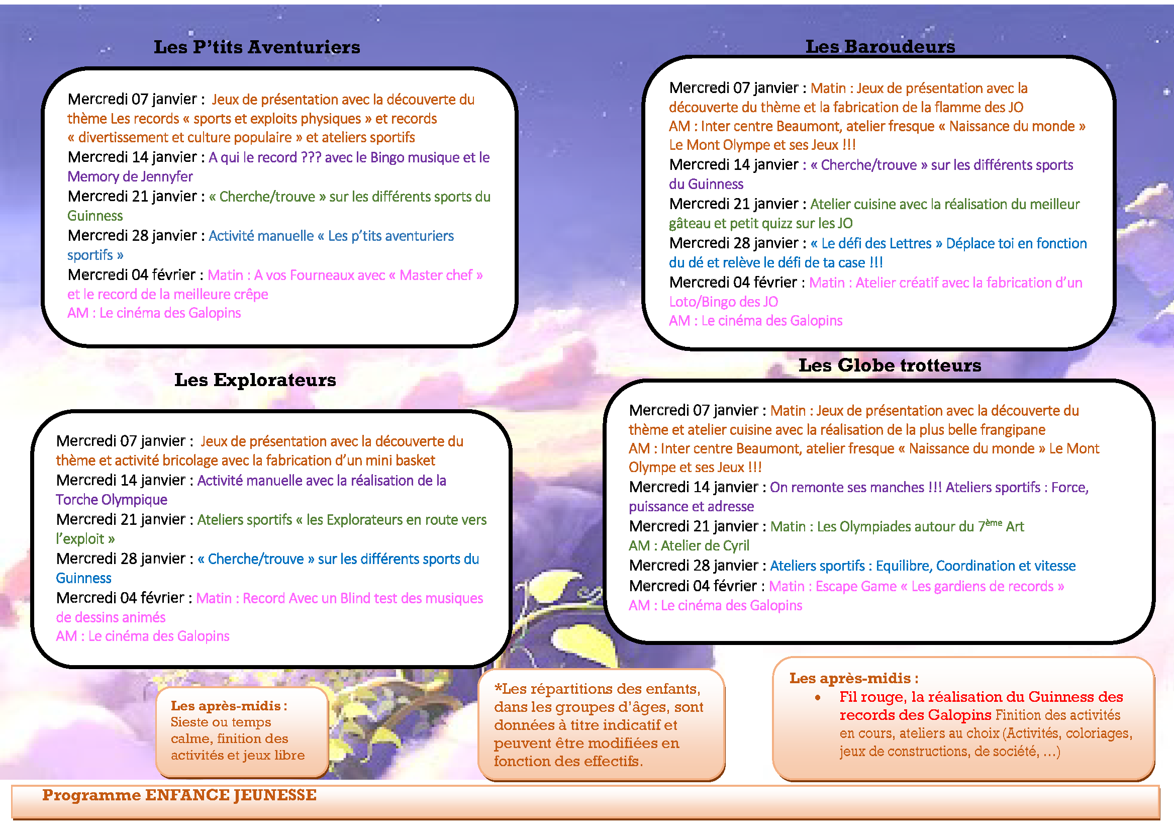 Les activités ont lieu entre 10h00 et 16h00, elles tiennent compte de l’âge et du rythme de l’enfant.
