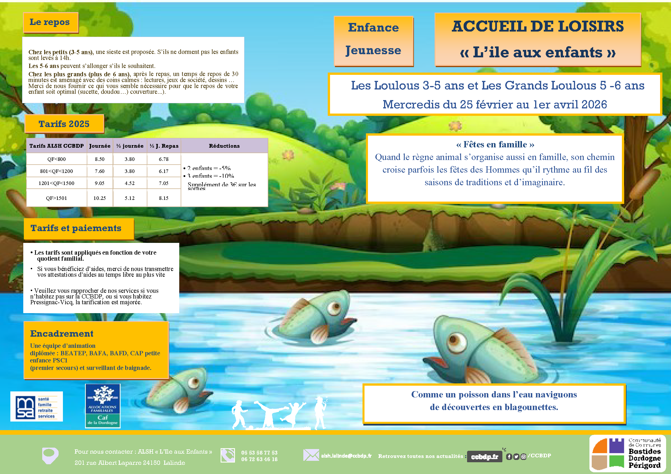 Vacances scolaires : 16 enfants moins de 6 ans et 24 à 61 enfants de + de 6 ans selon les périodes.